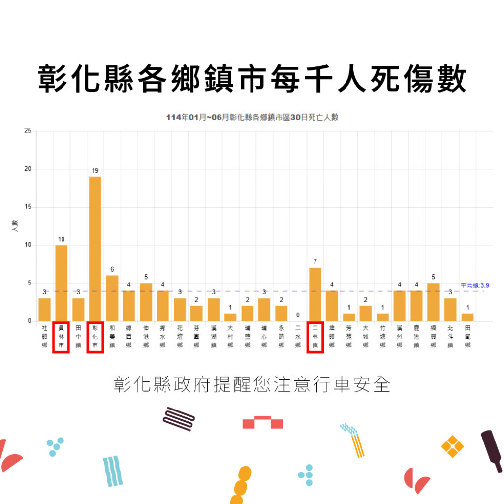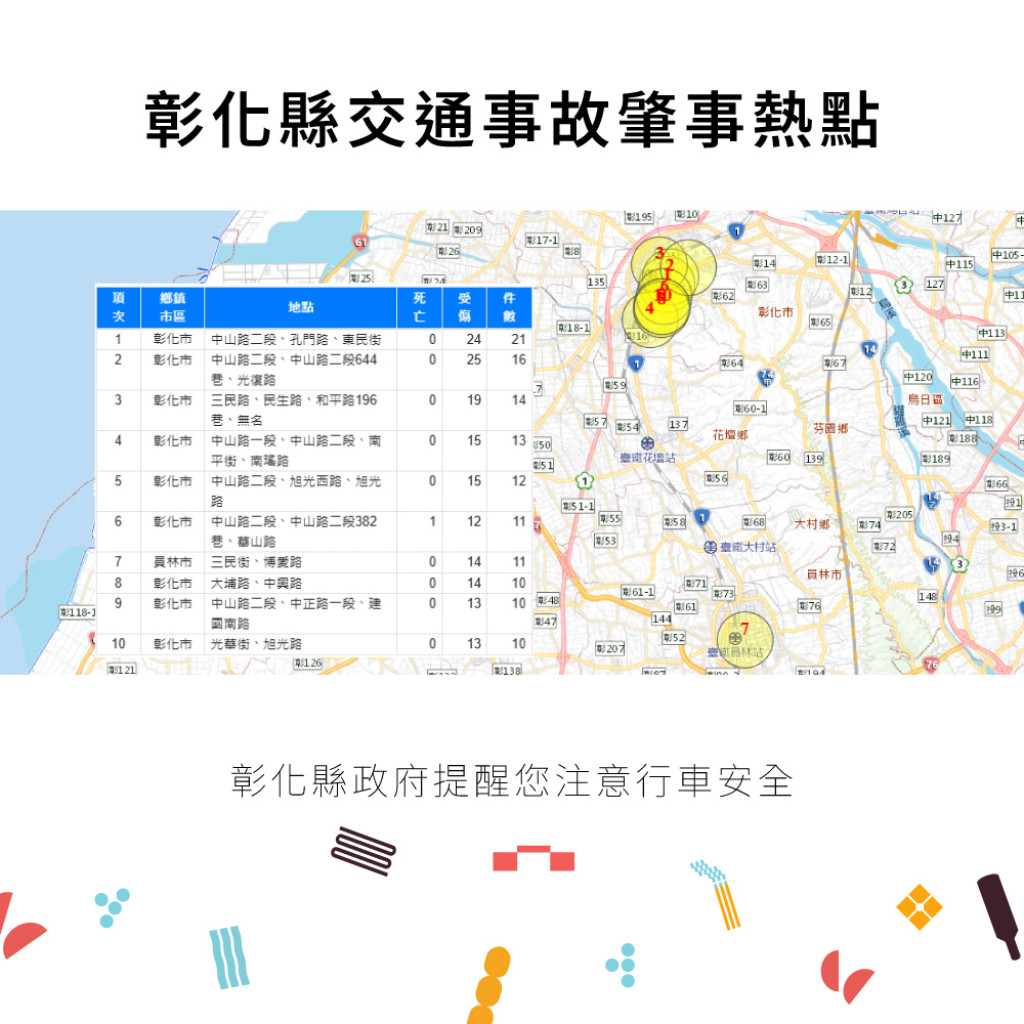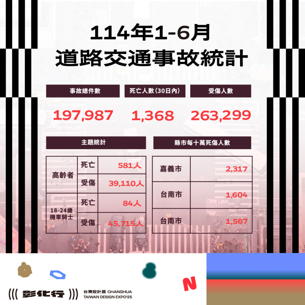 三、 附件為「114年1-6月全國道路交通事故統計、彰化縣交通事故總覽、本縣各鄉鎮市每千人死傷人數及肇事熱點」共4份統計資料宣導圖,社群宣導內容可參閱或分享本處「花現彰化-2025台灣設計展」(https://reurl.cc/mYjXKA)臉書粉絲專頁。