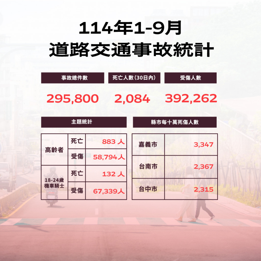 三、附件為「114年1-9月全國道路交通事故統計、彰化縣交通 事故死傷人數增加排行、本縣各鄉鎮市30日死亡人數、肇 事熱點及交通事故肇因統計」共5份統計資料宣導圖,社群 宣導內容可參閱或分享本處「花現彰化-彰化縣政府新聞 處」(https://pse.is/8h44cp)臉書粉絲專頁,相關宣導 圖片素材請參閱:https://reurl.cc/DbyGR5五、附件為「114年1-9月全國道路交通事故統計、彰化縣交通 事故死傷人數增加排行、本縣各鄉鎮市30日死亡人數、肇 事熱點及交通事故肇因統計」共5份統計資料宣導圖,社群 宣導內容可參閱或分享本處「花現彰化-彰化縣政府新聞 處」(https://pse.is/8h44cp)臉書粉絲專頁,相關宣導 圖片素材請參閱:https://reurl.cc/DbyGR5