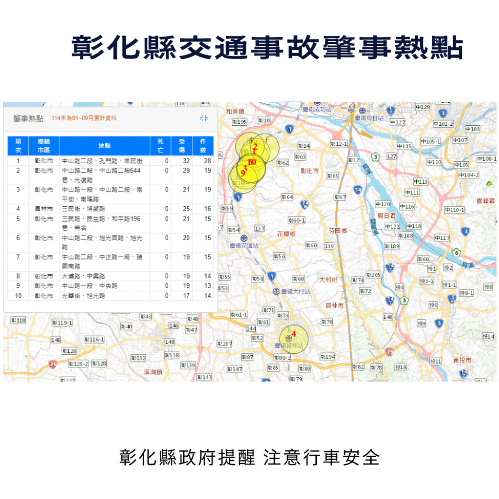 二、根據交通部道安資訊查詢網,本縣114年1-9月道路交通事 故與112年同期比較分析,以少年自行車騎士(含電自、電 輔) 事故增加45%最高,外籍人士事故增加34.3%次之,自 小客車駕駛人增加26%再次之。1-9月份鄉鎮市30日死亡人數於「彰化市、員林市、二林鎮」為多,肇事熱點以「彰 化市」為多,合先敘明。