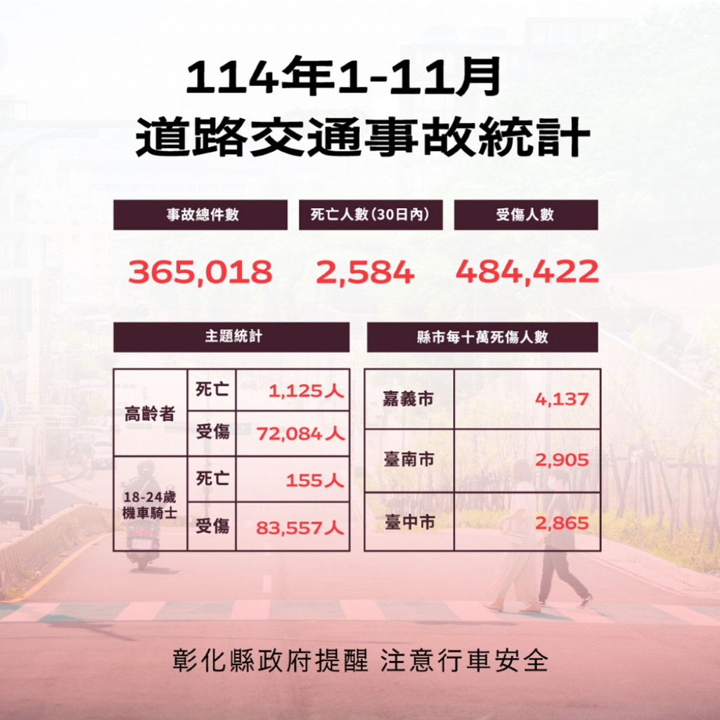 轉知-本縣114年1-11月道路交通事故死傷累計28,659人,共同降低死傷人數